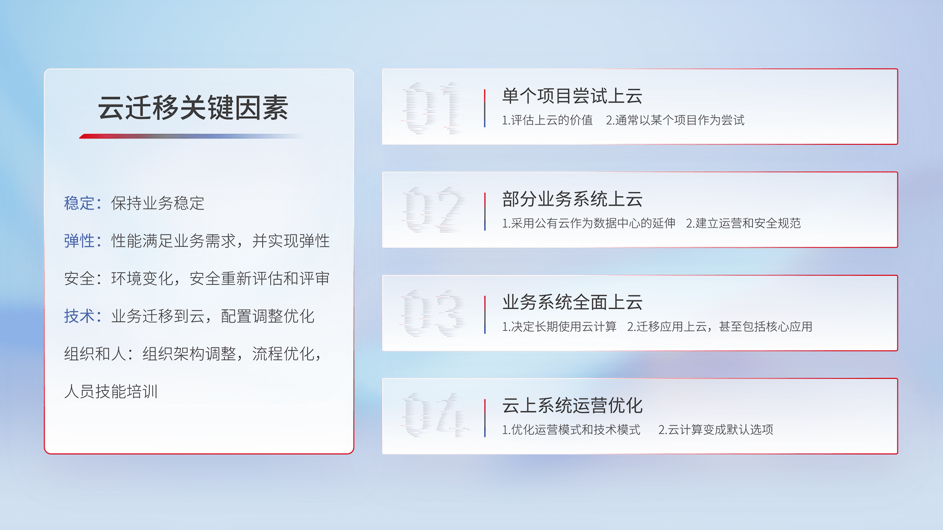 结合实际业务,,,从规划设计、、、、云平台选型、、、、云原生改造、、、、数据迁移、、、、集成交付,,,迁移全过程为客户识别最佳上云路径,,,做好风险识别管理,,,,设计网络架构、、、、身份权限、、安全审计合规、、操作审计、、、日志审计、、、、监控告警策略、、多站点容灾设计等,,对云上基础设施进行整体规划,,提升IT治理水平,,以满足弹性、、高可用、、高性能的需求。。