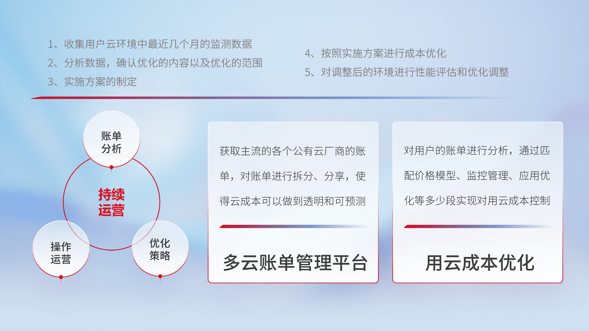 通过多云纳管,,,以统一的资源数据模型把客户的云资源进行抽象和封装,,,进而实现对多云资源的统一操作,,,,保障云资源管理的可靠性、、、稳定性与可用性。。。。量身定制化运维内容,,配置、、、开发运维、、、补丁管理、、、备份、、、监控、、认证和访问管理、、、审计和日常巡检等,,,,保障在用云过程中的可靠度,,,稳定度以及高可用率。。